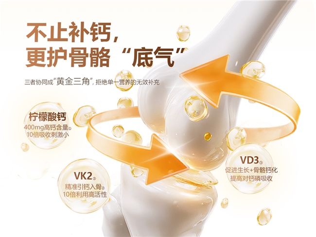 專利維生素D3選用專屬專利原料,經過多重嚴苛檢測,各項指標均符合國標標準,可精準作用于腸道吸收環節,助力鈣質高效轉化與吸收,減少營養浪費。它與微米級檸檬酸鈣、專利維生素K2共同構成“黃金三角專一補鈣配方”,三者協同作用、各司其職,搭建起“鈣質補給—腸道吸收—骨骼沉積”的完整補鈣鏈路,真正實現“鈣D同補、高效吸收”,讓每一份補充的鈣質都能被身體充分利用,遠超國標對吸收效率的基礎要求。